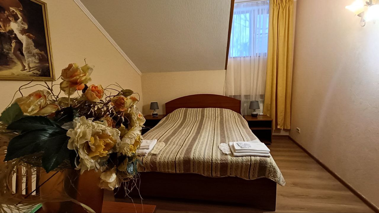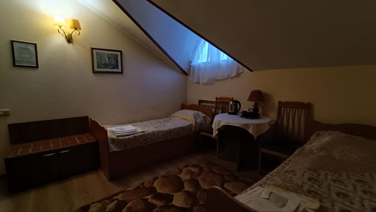 На втором этаже дополнительного корпуса, расположенного в 15 метрах от основного здания гостиницы, имеется двухкомнатный номер для четырехместного размещения. В одной комнате двуспальная кровать, в другой - две 1,5-спальные. Номер с собственным санузлом и душевой.